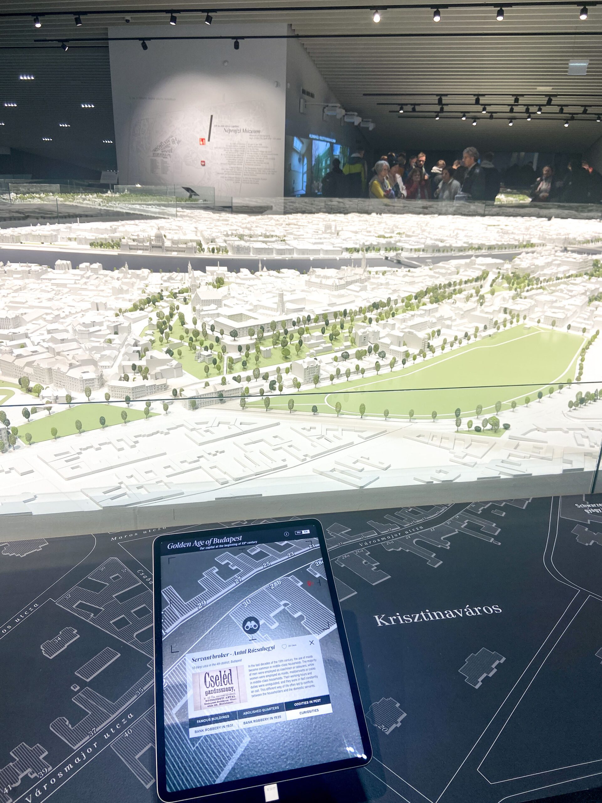 Aproape de intrare au cea mai cool chestie – o machetă interactivă a Budapestei din epoca de aur, când orașul avea printre cele mai rapide creșteri din lume, alături de New York, Chicago și Berlin. Macheta poate fi explorată folosind un ”telescop”– una din multele tablete aflate pe margine și prin prisma căreia poți afla detalii despre cartiere, clădiri, povești etc. Vă dați seama că m-am jucat până mi-am dat seama că e cam târzior și vreau să văd și restul.